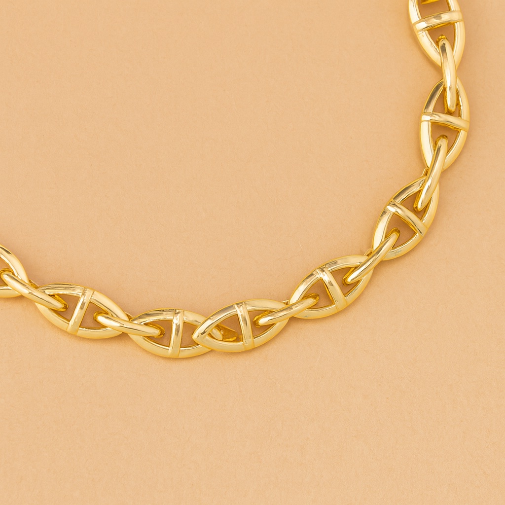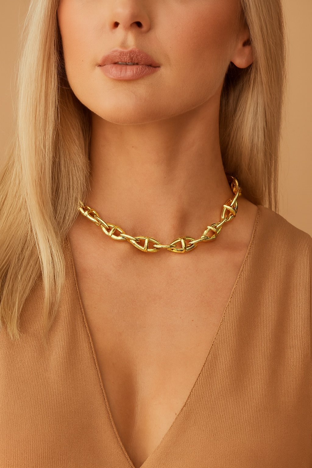 The Golden Tides Necklace is a bold yet timeless statement piece designed to elevate any look. Crafted with a luxurious rhodium base and plated with 24K gold, its unique interlocking links reflect light beautifully, creating an elegant glow against the skin. Perfect for special occasions or everyday sophistication, this necklace embodies modern glamour with a classic touch — a true reflection of refined style.