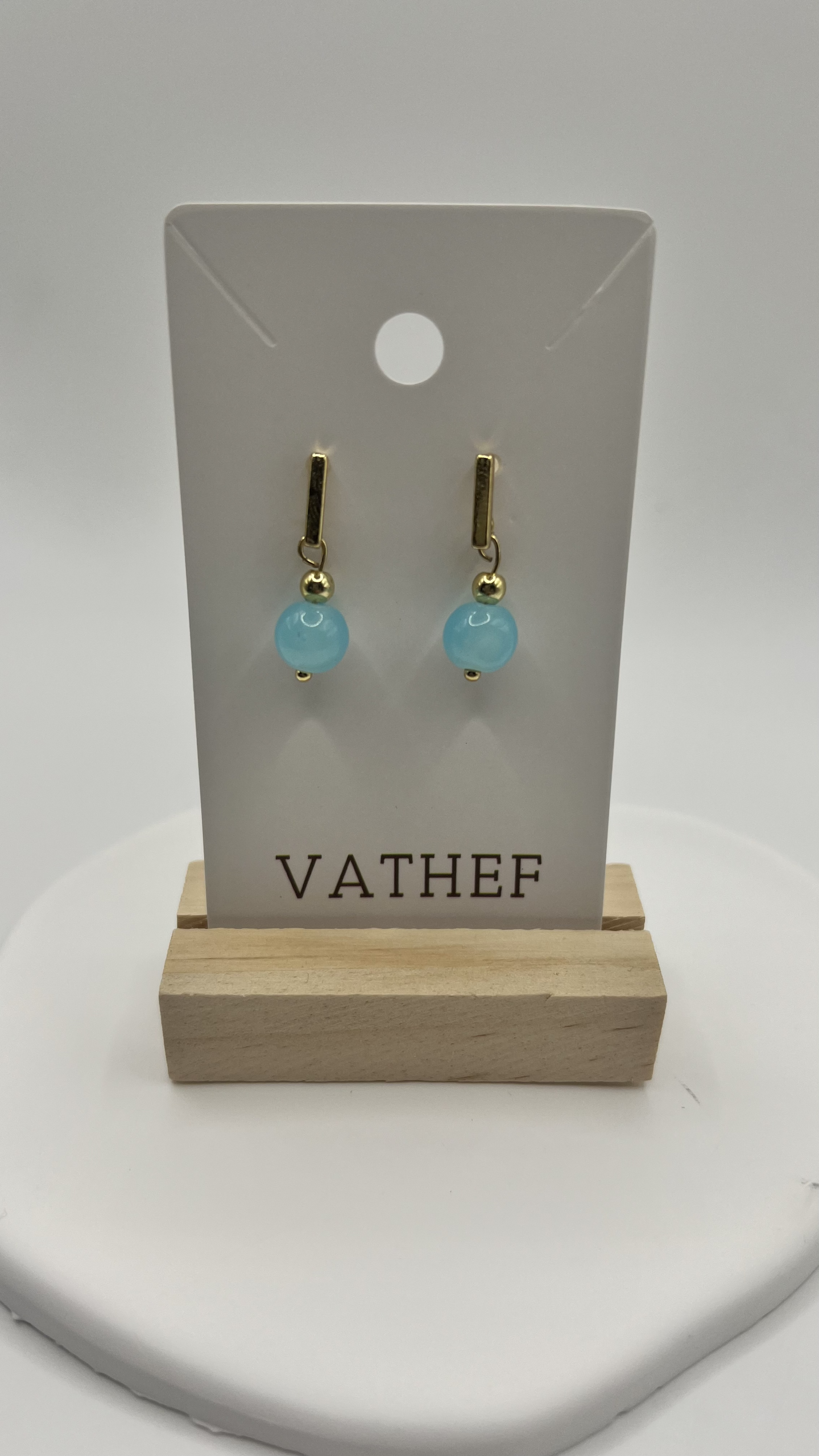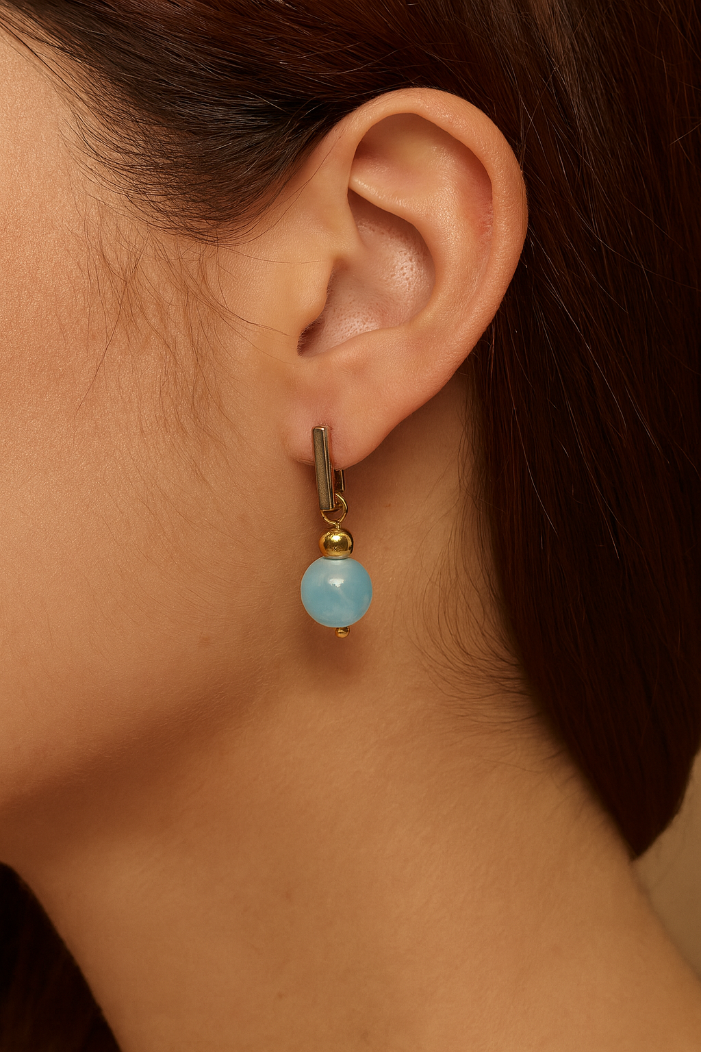 These gold-plated earrings feature a delicate crystal bead that shines with a soft translucent blue, creating a timeless and versatile accessory. The smooth round design reflects the light beautifully, making them perfect for both everyday wear and special occasions. Lightweight and comfortable, these earrings combine elegance with modern simplicity, giving you a chic touch that pairs effortlessly with any outfit.”