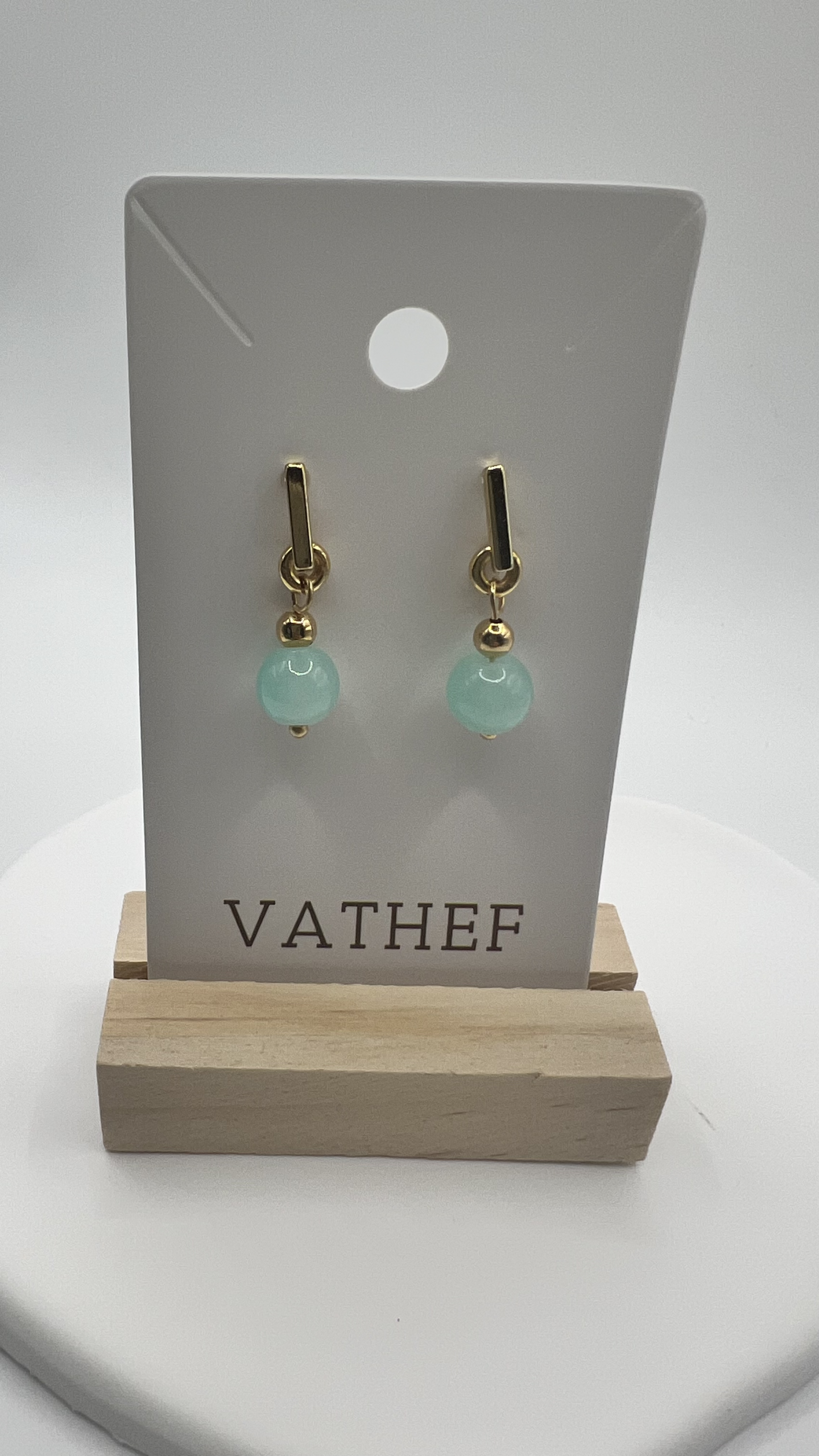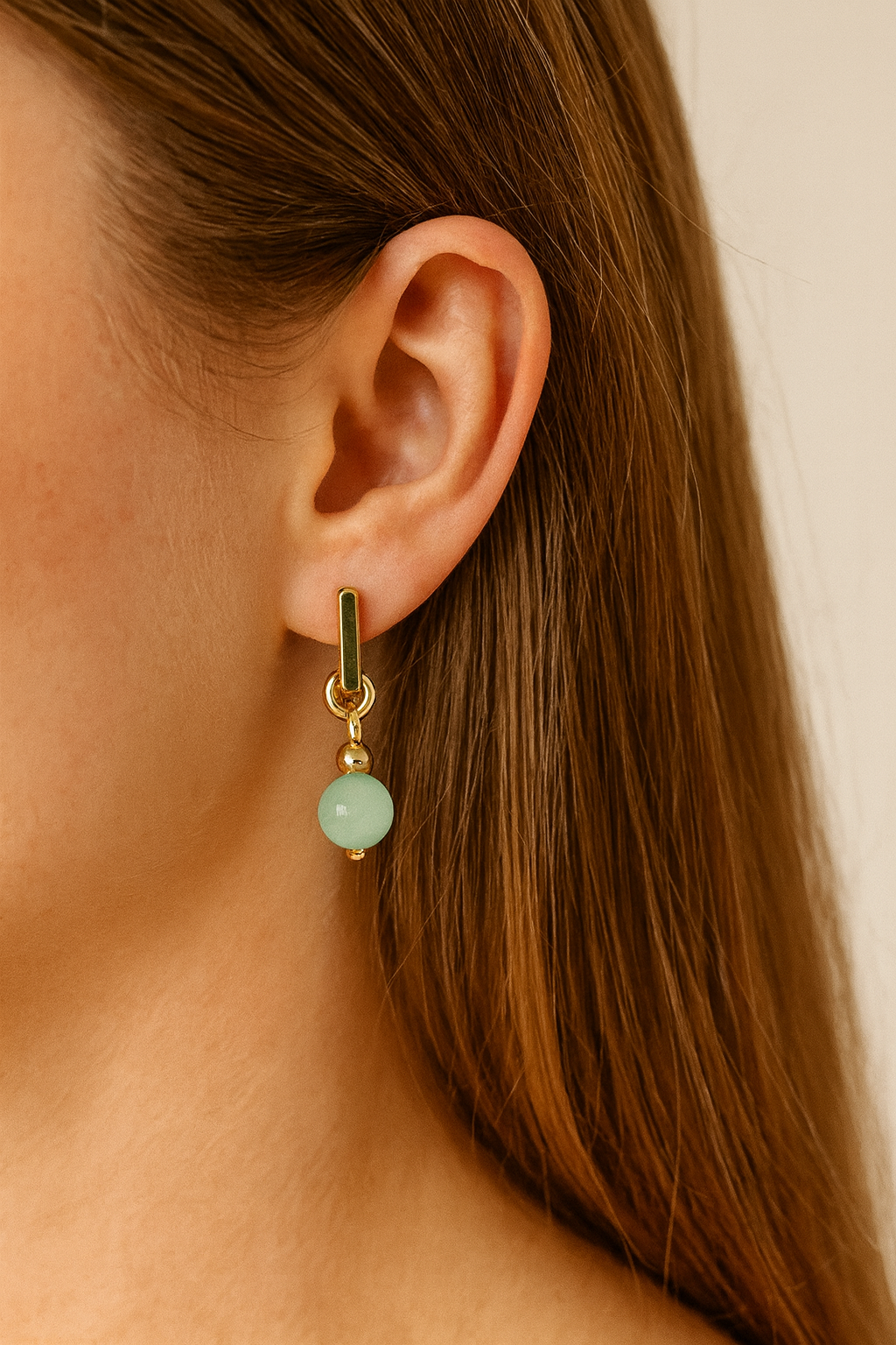 Elevate your everyday style with these elegant gold-plated earrings featuring soft Teal crystal beads. Their minimalist yet sophisticated design combines a modern golden bar with a delicate round bead, creating a timeless accessory that transitions seamlessly from day to night. Lightweight and versatile, they are the perfect touch of color and shine to complement both casual outfits and special occasions.