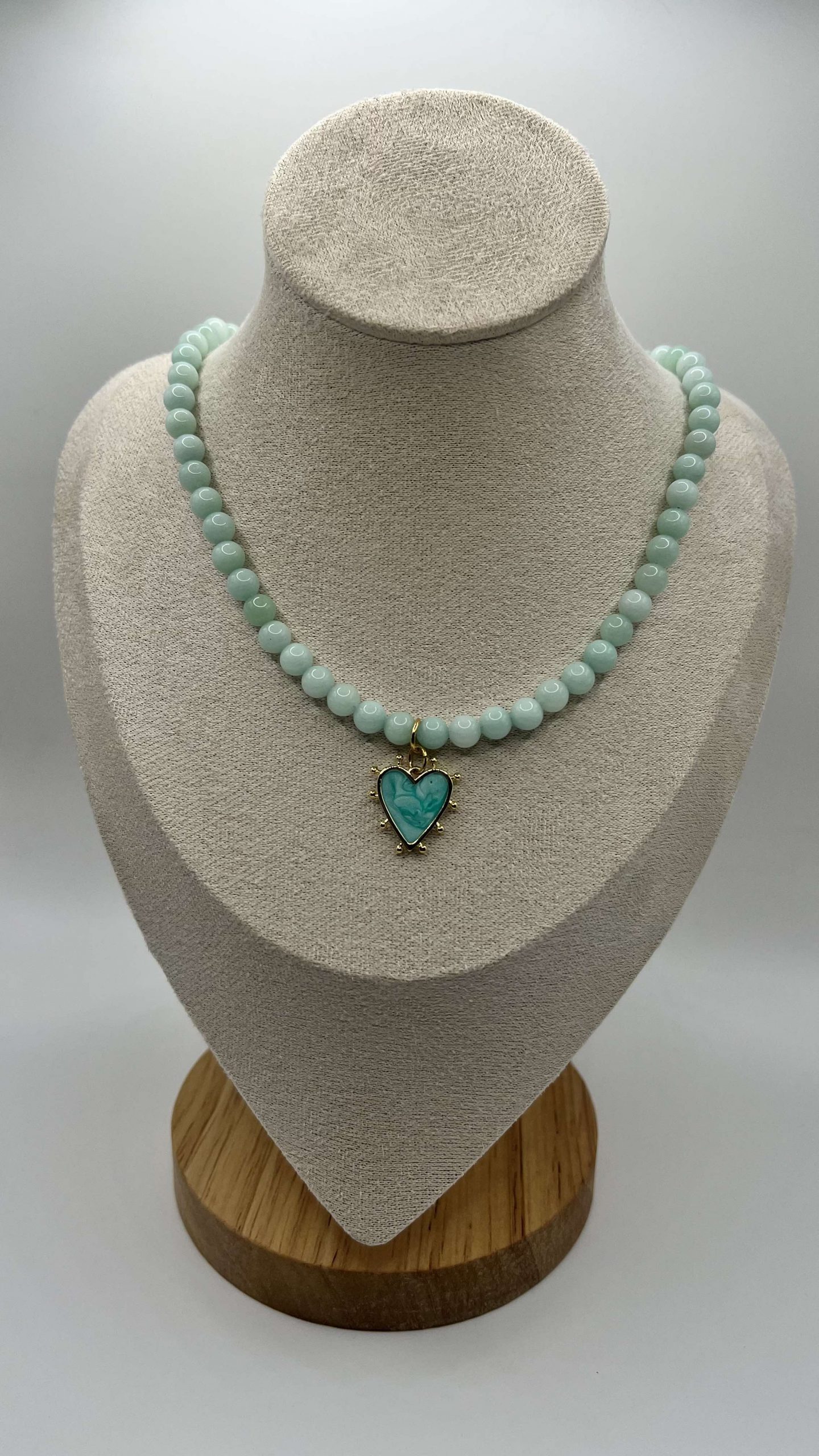 A modern and elegant necklace featuring light aqua agate beads, gold-plated accents, and a teal heart pendant with a marbled finish.