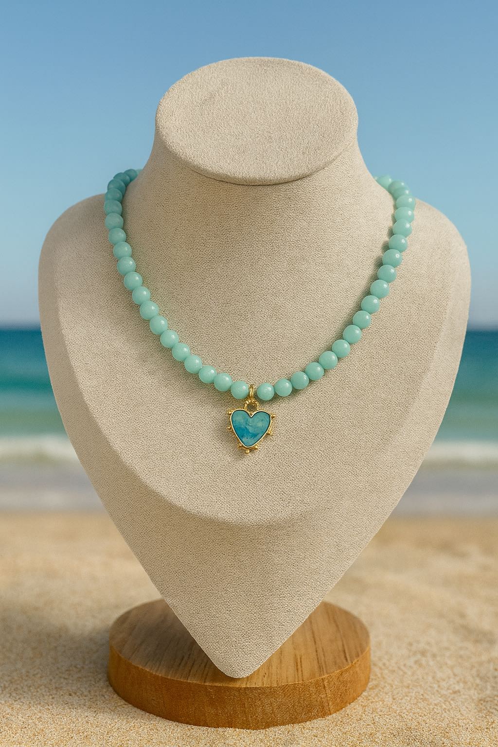 This elegant necklace features polished aqua agate beads that radiate a soft, natural glow. Each bead is smooth and cool to the touch, reflecting the timeless beauty of the ocean. A gold-plated heart pendant adds a delicate and romantic touch, making this piece perfect for both everyday wear and special occasions. Handcrafted with attention to detail, this necklace embodies elegance, and modern sophistication.