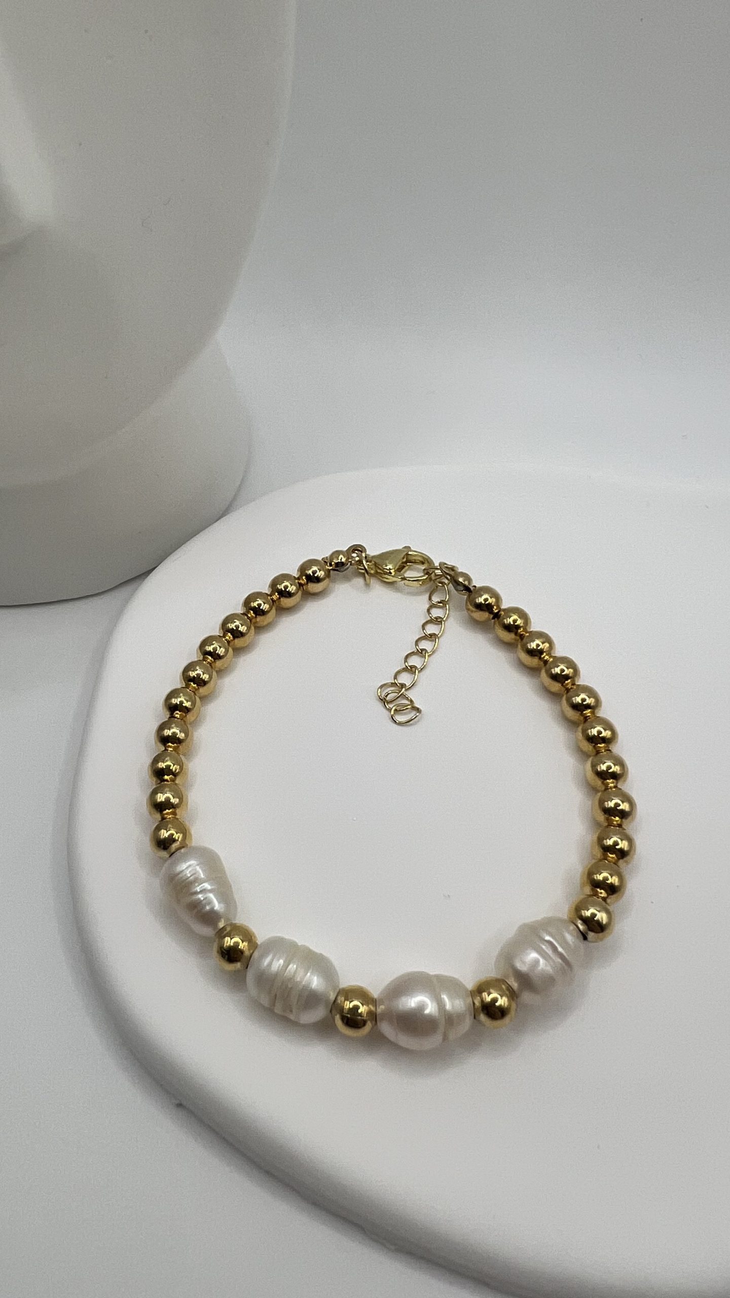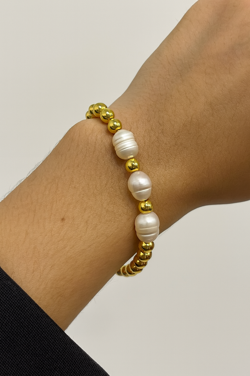 The Baroque Glow Bracelet reflects timeless elegance and natural beauty. Handcrafted with 18K gold-plated beads and genuine freshwater pearls, each piece tells a story of grace and sophistication. The soft luster of the baroque pearls contrasts beautifully with the polished golden spheres, creating a radiant balance between organic texture and refined shine. Perfect for women who appreciate understated luxury, this bracelet transitions effortlessly from day to evening, embodying the essence of VATHEF.