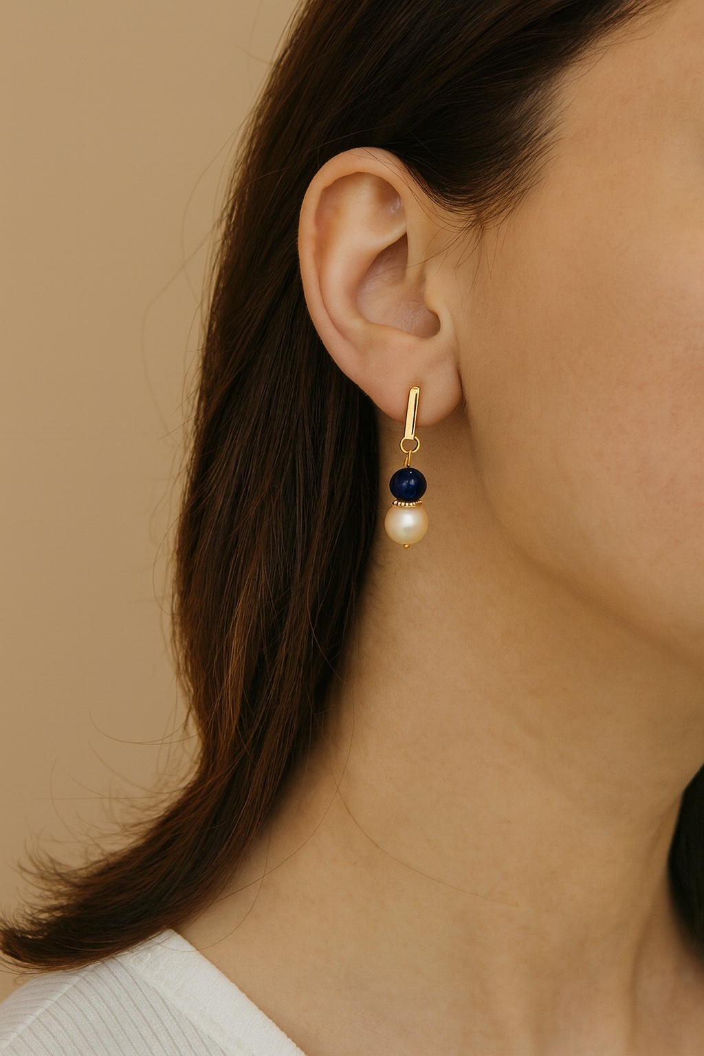 These handcrafted earrings combine the serene beauty of lapis lazuli with the classic charm of pearl beads, delicately set on a sleek gold-plated base. The minimalist bar design adds a modern edge, making them perfect for both everyday elegance and special occasions. A refined statement piece that embodies timeless style and sophistication.