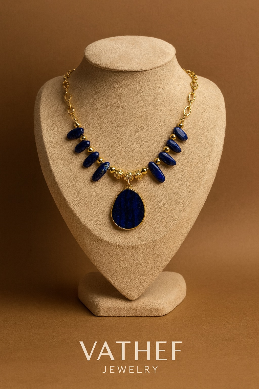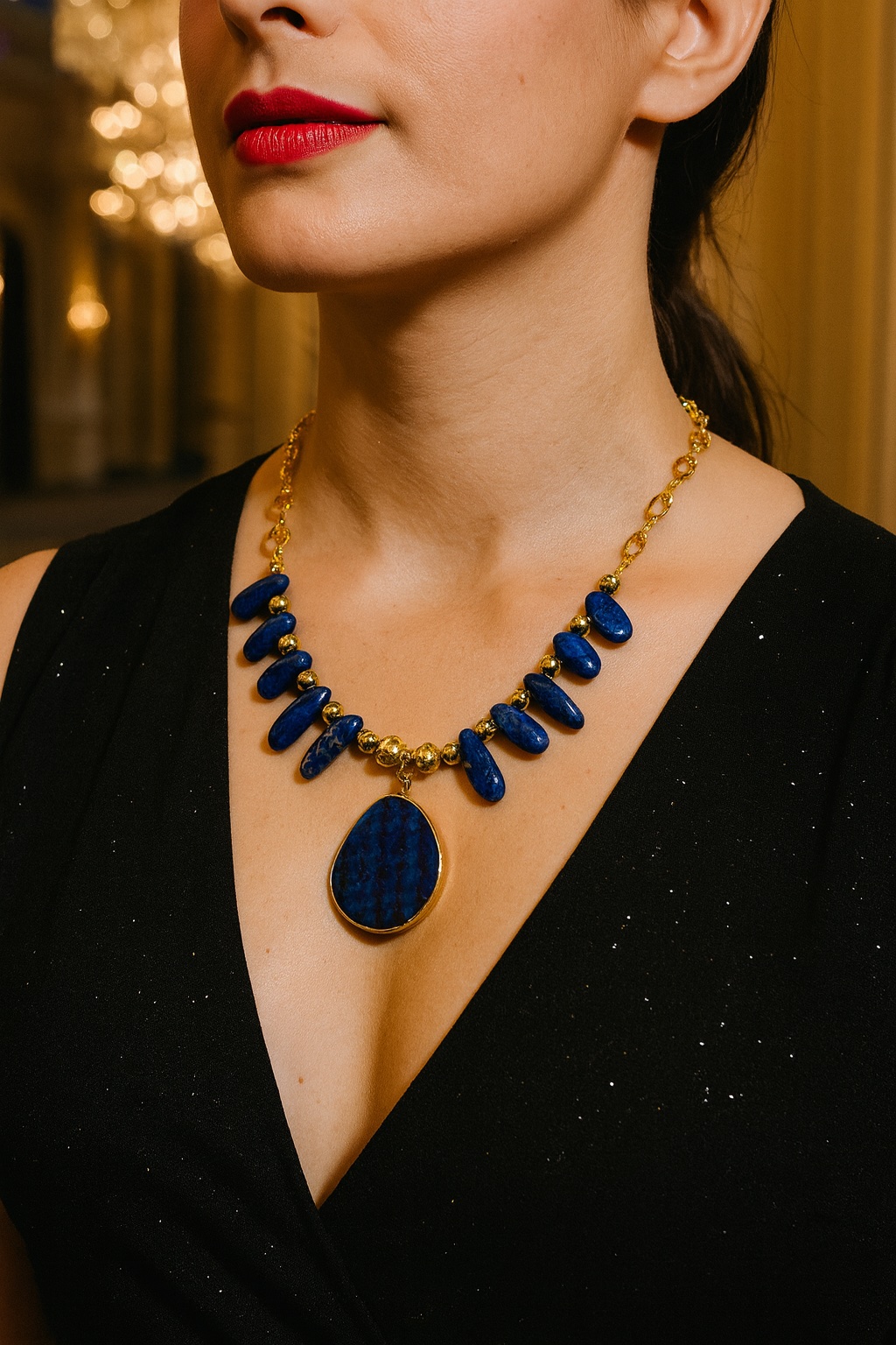 The “Midnight Royalty” necklace blends the deep, mesmerizing blue of freeform lapis lazuli stones with the warm glow of 18k gold plating. Each stone is one of a kind, creating a handcrafted design that exudes timeless elegance and modern luxury. The bold central pendant framed in gold makes this necklace a true statement piece — perfect for elevating any outfit or wearing to a special occasion.