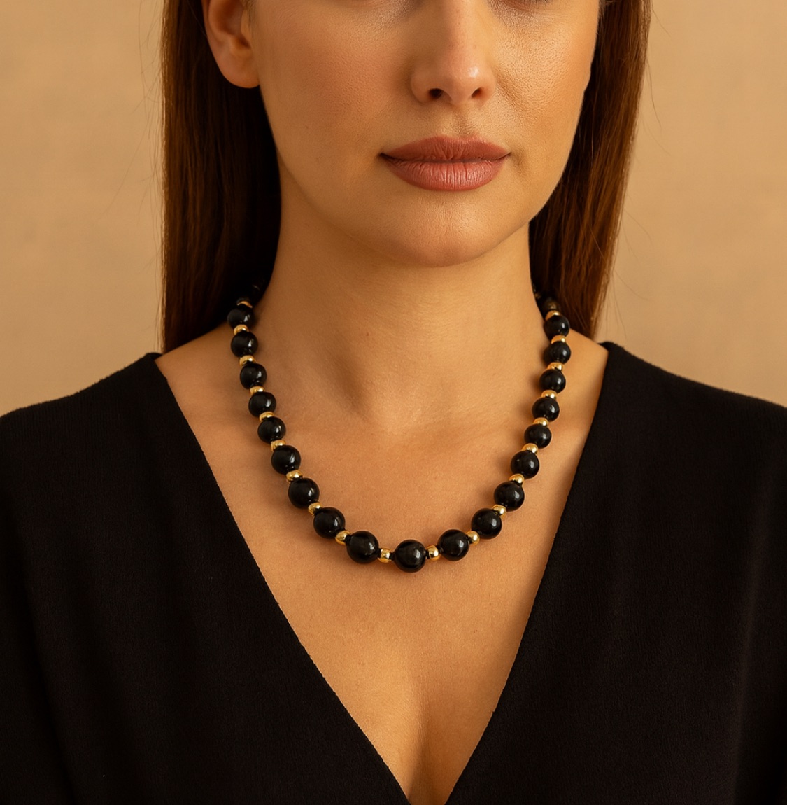 An elegant necklace featuring natural black agate stones and 18K gold-plated details. A timeless and sophisticated piece that elevates any outfit.