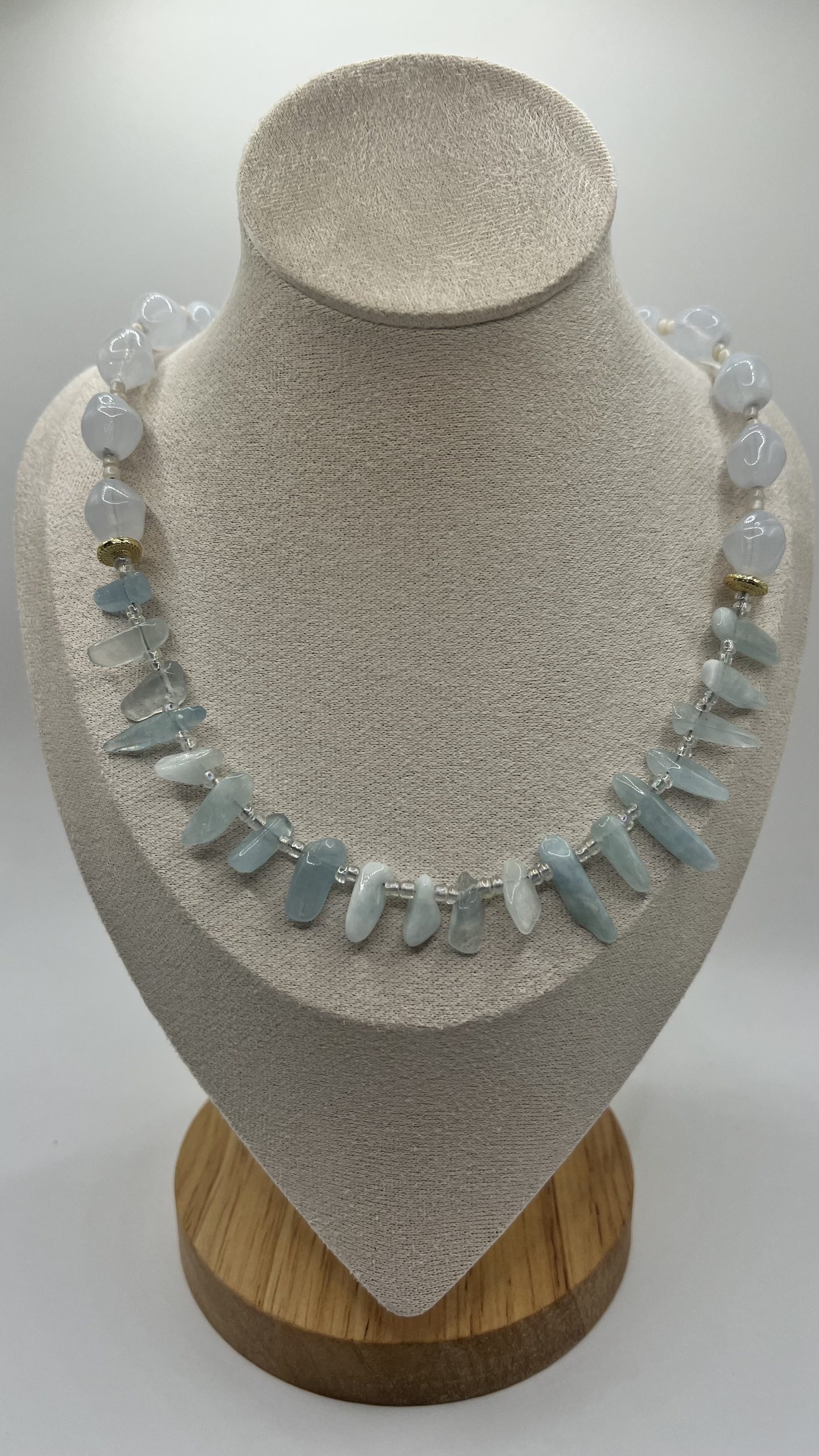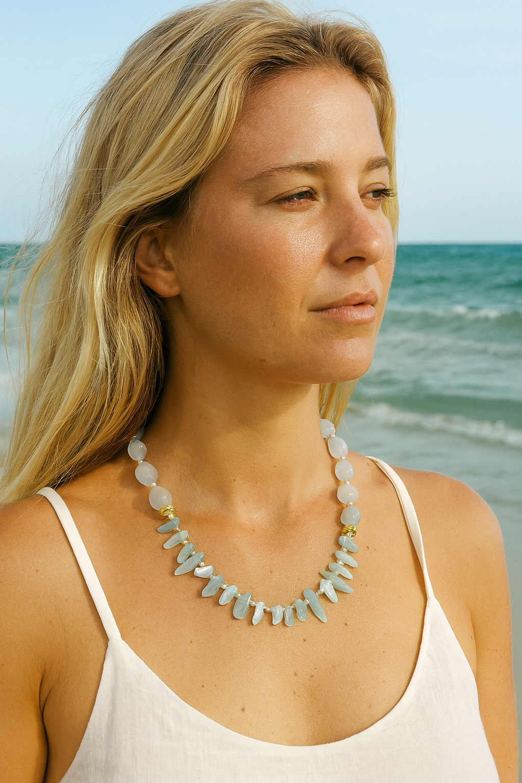 The Ocean Soul necklace embodies the serene elegance of the sea. Handcrafted with natural aquamarine freeform teeth, and delicate crystal beads, it captures the gentle rhythm of ocean waves and the light of a summer horizon. Each stone’s organic shape and translucent blue tone reflect the purity of nature and the timeless beauty of coastal calm. A piece designed for women who carry the spirit of the sea — graceful, confident, and endlessly radiant.